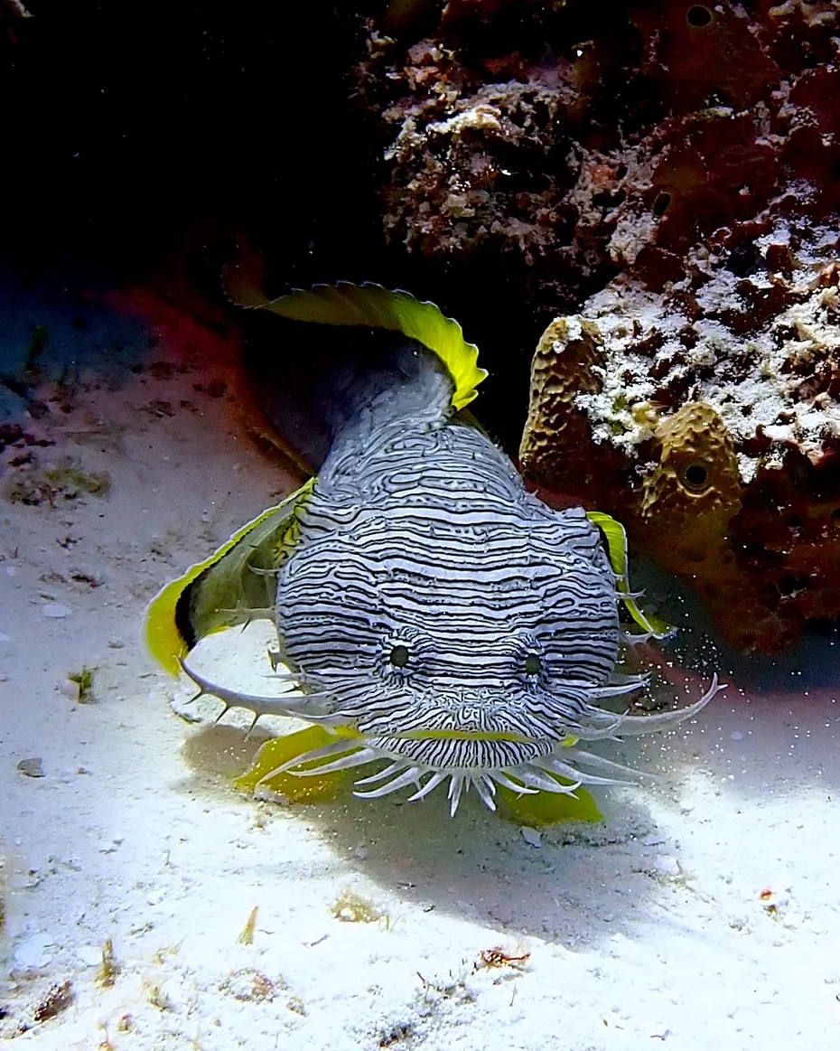 The Splendid Toadfish makes a unique underwater sound. This will sound like a frog/toad or a honking sound. When you are near it’s home you may hear it and get louder as you are closer.